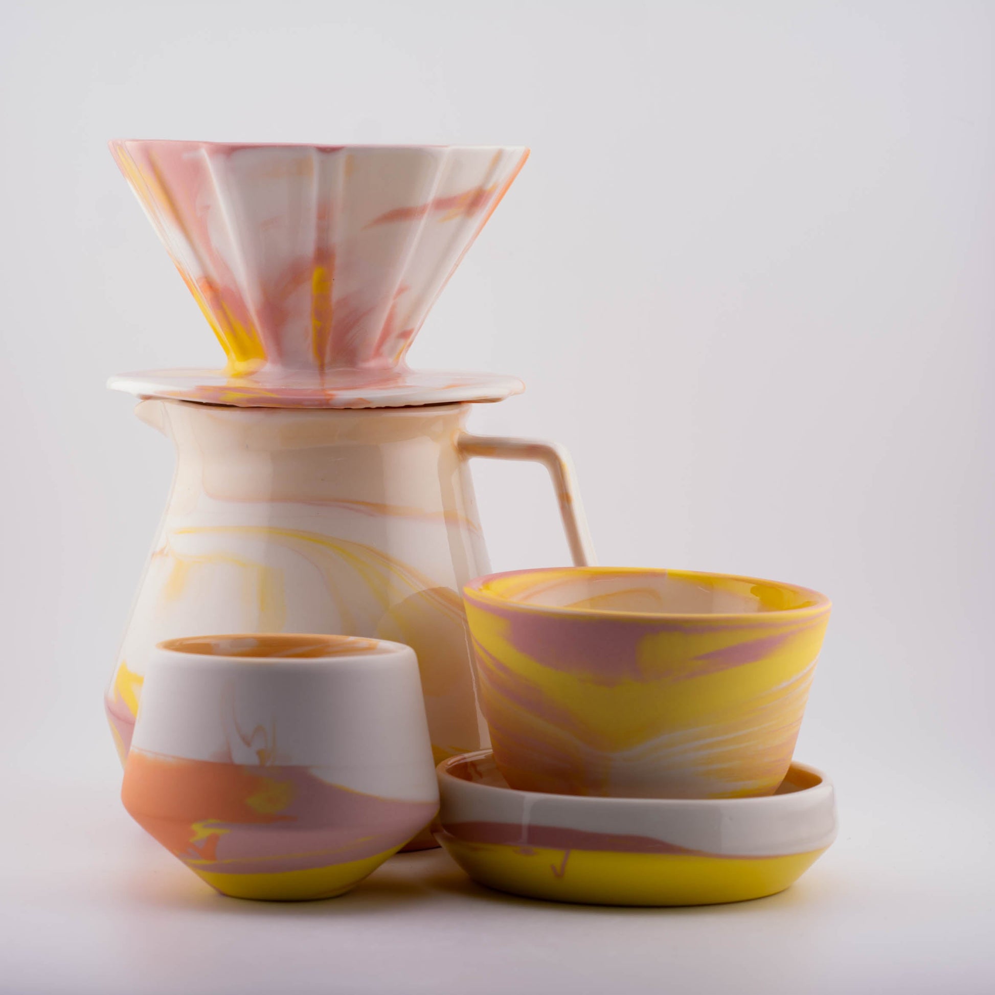 Each piece is handcrafted using high-quality porcelain, slip-cast with precision, and fired at 1260°C for durability. The set’s minimalist aesthetic makes it a perfect addition to any coffee setup, whether at home or in a professional café.