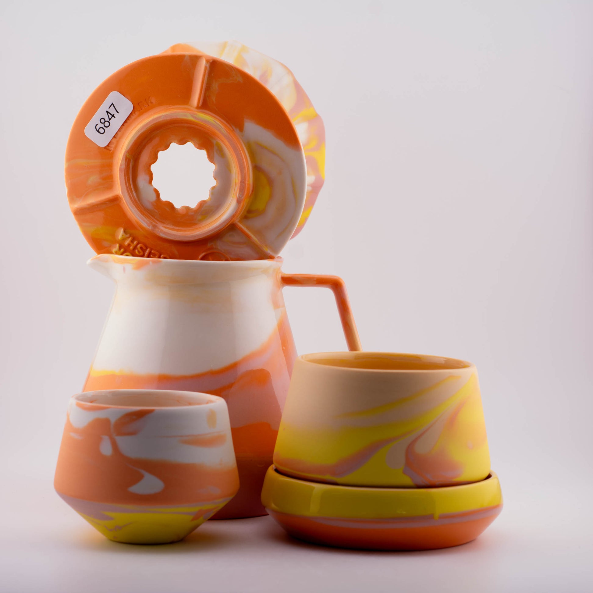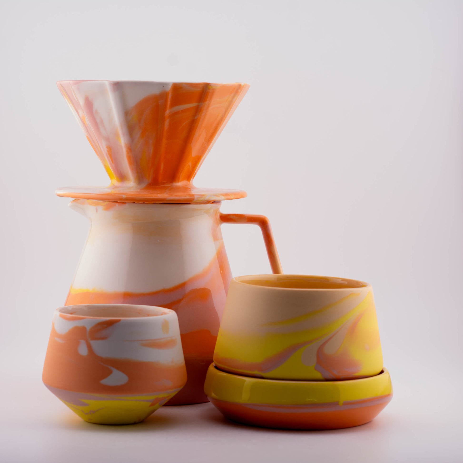 Each piece is handcrafted using high-quality porcelain, slip-cast with precision, and fired at 1260°C for durability. The set’s minimalist aesthetic makes it a perfect addition to any coffee setup, whether at home or in a professional café.